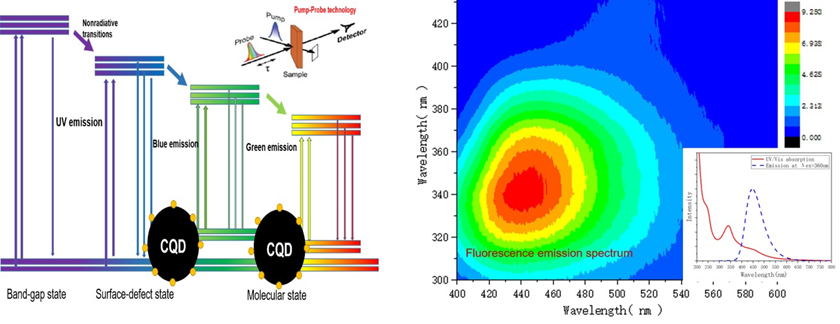 图 6:通过调控碳源和掺杂前驱体,合成具有UV- Visible波段的荧光发射的碳点。基于瞬态吸收光谱(TA),研究碳点的碳核态、表面缺陷态和分子态,在光催化体系下的电荷转移动力学过程。