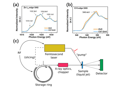 图 5:(a)(b)在酸处理前后,测试ZnO中的 Zn L-edge和 O K-edge的XAS,证明了ZnO经酸处理后氧空位增多;(c)通用同步加速器超快泵浦探测束示意图。