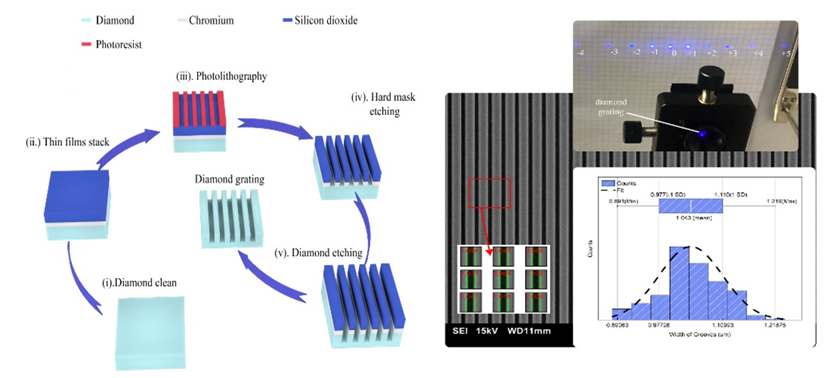 图 8:利用激光直写光刻和反应离子束刻蚀实现可见光波段的金刚石光栅制备,实现核心刻蚀工艺的突破。目前致力于金刚石离子束注入光刻的实现,实现高效率高准确度的金刚石光刻工艺。