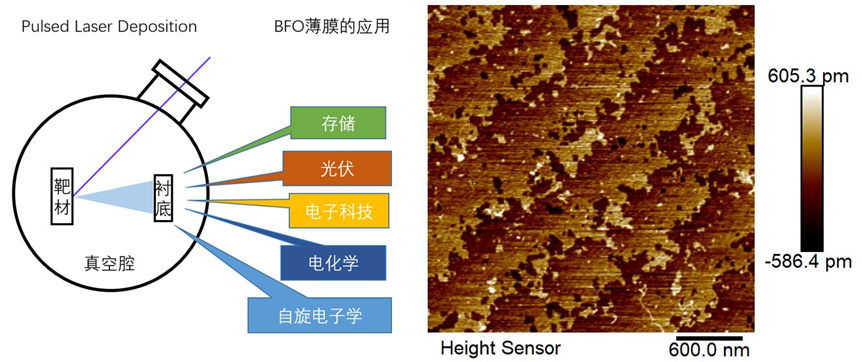 图 10:利用脉冲激光沉积技术(Pulsed Laser Deposition)在衬底上沉积BiFeO3 (BFO)薄膜,用XRD和RSM(Reciprocal Space Mapping),AFM技术来判断薄膜生长的质量,并采用C-AFM(Conductive-AFM),PFM(Piezoresponse Force Microscopy)等方法来进行电学测试,同时结合课题组的XAS技术,研究BFO薄膜的晶体结构,铁电性以及反铁磁性三者之间的耦合关系和其他独特性质。左图为PLD技术示意图,右图为经过氢氟酸酸洗后得到的具有原子台阶的SrTiO3衬底表面的AFM测试结果。
