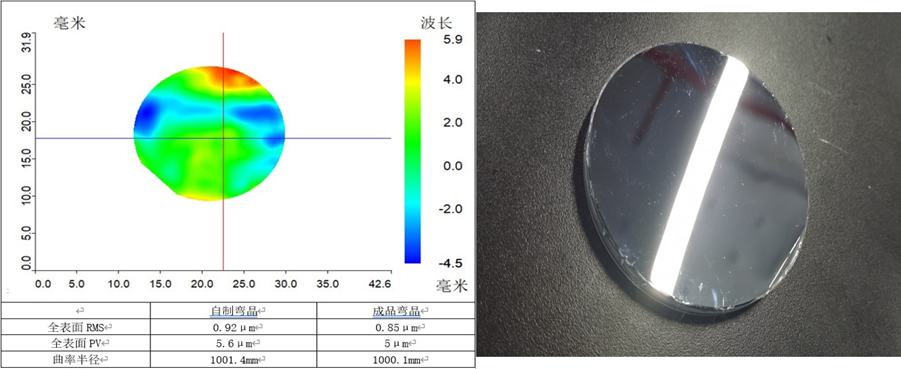 图 9:将硅/锗/石英晶片压弯并粘接在玻璃基底上,保证曲率半径和表面形貌满足使用条件。使用胶水粘合工艺,完成半径1000mm弯晶单色器的制备,且表面RMS、聚焦性能、曲率半径等几何面型参数与成品弯晶接近。