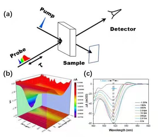 图 4:利用超快光谱技术研究量子点表面缺陷对电子转移过程影响。(a)泵浦探测技术原理示意图;(b)(c)CdSe QDs的瞬态吸收光谱。