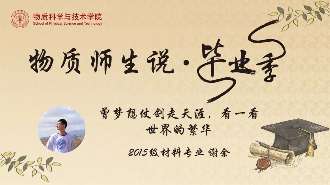 钟超(物质学院助理教授):谢余同学是一个能兼顾德智体全面发展,综合素质很好的学生。大三的MIT交换学习经历以及我们课题组的科研锻炼让他对国外学习和科学研究有了直观的认识和宝贵的体验。难能可贵的是无论是国外交换学习还是在后期的研究生院申请过程在经历了不少挫折之后,他都能保持良好的心态,勇往直前,最终实现现阶段的小目标。海阔凭鱼跃、天高任鸟飞,相信乐观、自信的谢余同学未来一定可以实现他心中更多更大的目标。