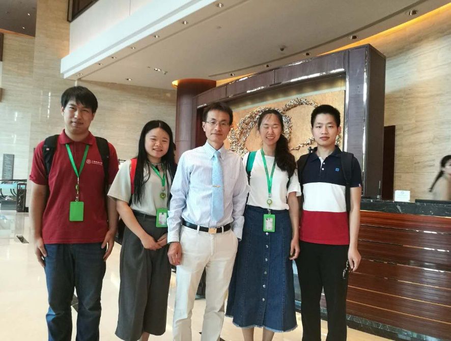姜显园(右一)与志愿者同学在2017 STAR会议上与物质学院创始院长杨培东合影