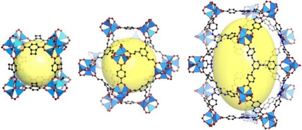 多孔材料在气体吸附分离、气体存储、湿度控制、分子传感、能量转化、择型和手性催化等有广阔的应用前景。按照孔径大小的尺度,IUPAC将孔分为微孔(< 2 nm),介孔或中孔(2 ~ 50 nm),大孔(> 50 nm);按照最新定义,在微孔部分又分为超微孔(< 0.7 nm),极微孔(0.7 ~ 2 nm),而将小于100 nm以下的孔统称为纳米孔。本课题组主要研究金属-有机框架(MOFs)、共价有机框架(COFs)和沸石咪唑框架(ZIFs)等新概念材料的设计合成和定向组装。