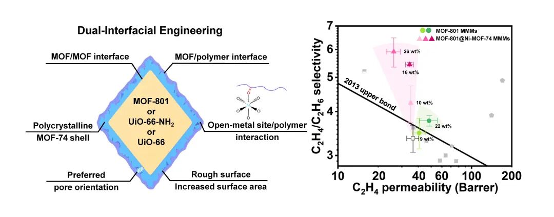图 | “双界面修饰”法示意图(左);C2H4/ C2H6的分离膜渗透性与选择性关系