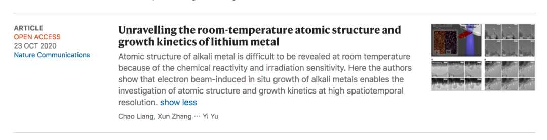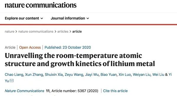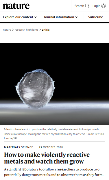 上海科技大学物质学院于奕课题组在碱金属的室温原子结构研究中取得重要进展。研究工作以Unravelling the room-temperature atomic structure and growth kinetics of lithium metal为题,于10月23日在国际知名期刊《自然·通讯》(Nature Communications)上在线发表,并被Nature Communications期刊评选为编辑亮点(Editors’Highlights)推荐论文。文章发表后迅速得到关注,《自然》(Nature)于10月29日发表了题为How to make violently reactive metals and watch them grow的研究亮点(Research Highlight)评论文章,对于该项研究工作给予积极评价。