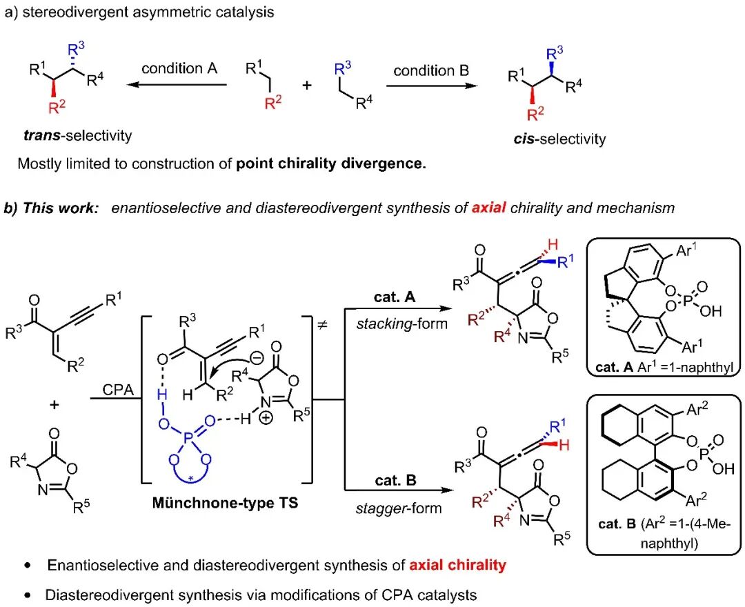 杨晓瑜课题组近期研究以手性Brønsted酸催化实现基于噁唑酮底物的新颖不对称(环)加成反应。课题组前期实现了基于噁唑酮和3-氨基烯丙基叔醇的不对称[4+2]环加成反应,高效合成具有连续手性季碳中心的手性二氢吡啶酮产物(Org. Lett., 2020, 22, 5633)。近期,课题组利用手性Brønsted酸作为手性催化剂实现了噁唑酮对活化1,3-烯炔的不对称加成反应合成三取代手性联烯产物,并且通过手性磷酸结构改造的方法首次实现了基于轴手性的立体发散式不对称催化合成。该工作中,杨晓瑜课题组与南开大学彭谦教授课题组合作,通过计算化学研究阐述了反应的分步机理,并且解释了催化剂结构改变在产生轴手性关键步骤中导致非对映选择性翻转的内在原因。在该方法中,具有轴手性发散性的三取代手性联烯的两个非对映体都能以较高产率、高对映和非对映选择性方便合成,克级规模的制备以及手性产物丰富的转化反应充分证明了该方法在多样性导向合成中的应用。