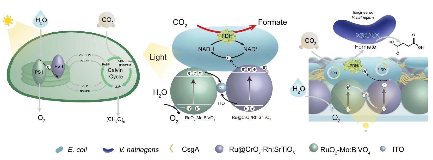 与中国科学院深圳先进技术研究院定量合成生物学全国重点实验室/合成生物学研究所钟超课题组、高翔课题组合作,将还原力产生、CO2固定与碳链延长分别交由不同功能模块完成,通过合成生物学改造、人工微生物群落设计与光催化剂合成的交叉创新,首次实现了以CO2和H2O为原料光驱动合成C4长链分子丁二酸,为绿色化学品合成开辟了新路径。
