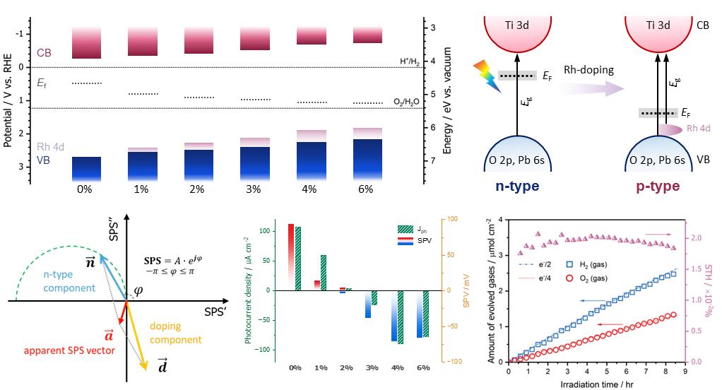 本文首次通过Rh掺杂实现了PbTiO3半导体从n型向p型的转变,修饰后的Rh:PbTiO3光阴极与Mo:BiVO4光阳极构建的无偏压体系在模拟阳光下实现化学计量比全水分解。针对Rh掺杂诱导的n-p型转变机制,团队创新性地引入了表面光电压谱(SPS)矢量分解技术进行分析,通过将总光电压信号分解为不同相位的矢量分量,仅借助宏观测量,实现在微观尺度上定量隔离了由Rh掺杂引起的阴极贡献,从而准确解释了半导体从n型向p型转换的物理本质。该工作建立了一套基于先进光电谱学的半导体能带工程与物种识别分析方法,为未来设计新型光电极材料提供了重要的理论指导和技术支撑。